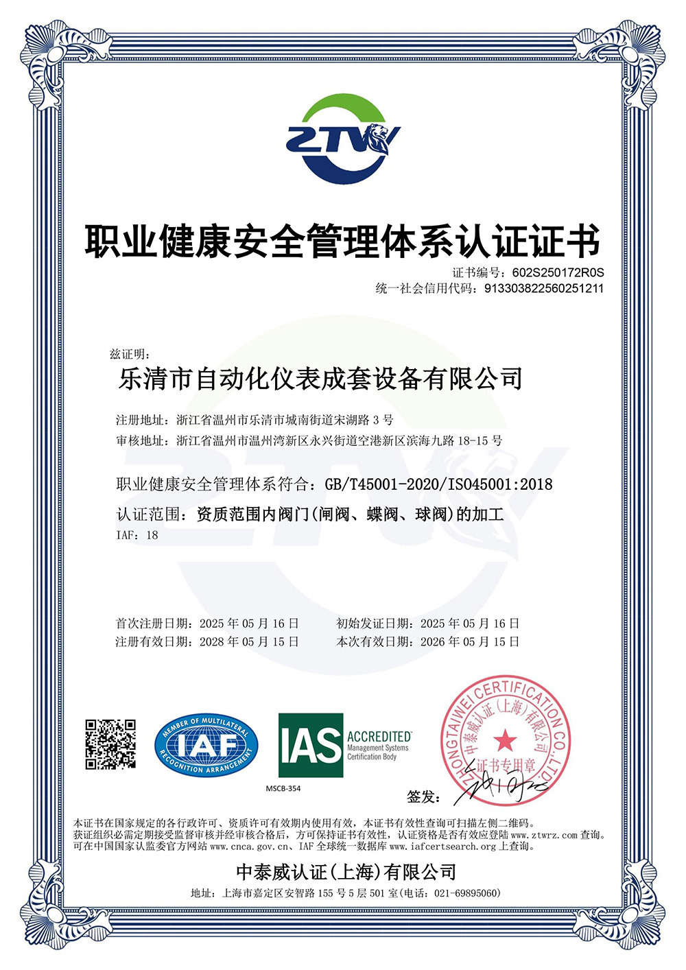 职业健康安全管理体系认证证书